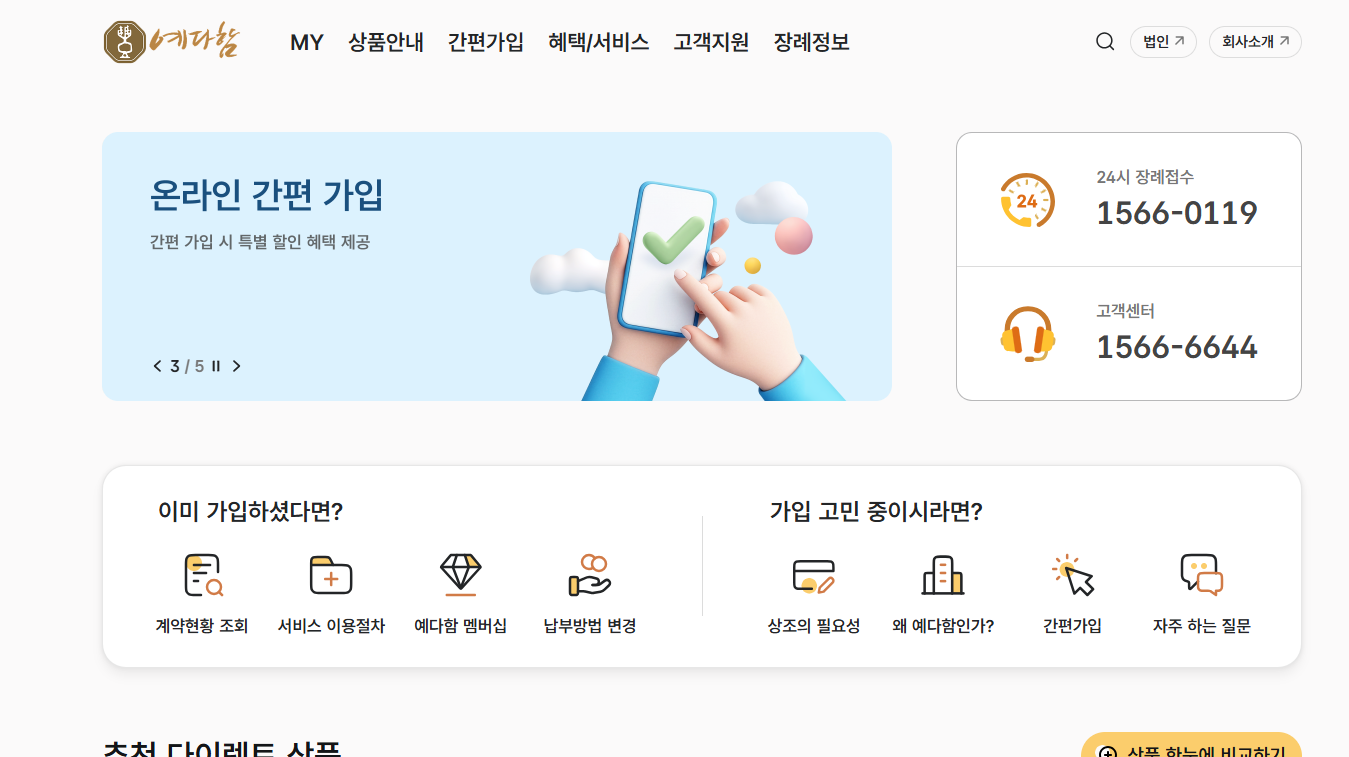 2026년 1월, 예다함은 '쉽고 편리한 상조 서비스' 구현을 목표로 공식 홈페이지를 새롭게 개편했습니다. 개편된 홈페이지에서는 다음과 같은 기능을 이용할 수 있습니다.