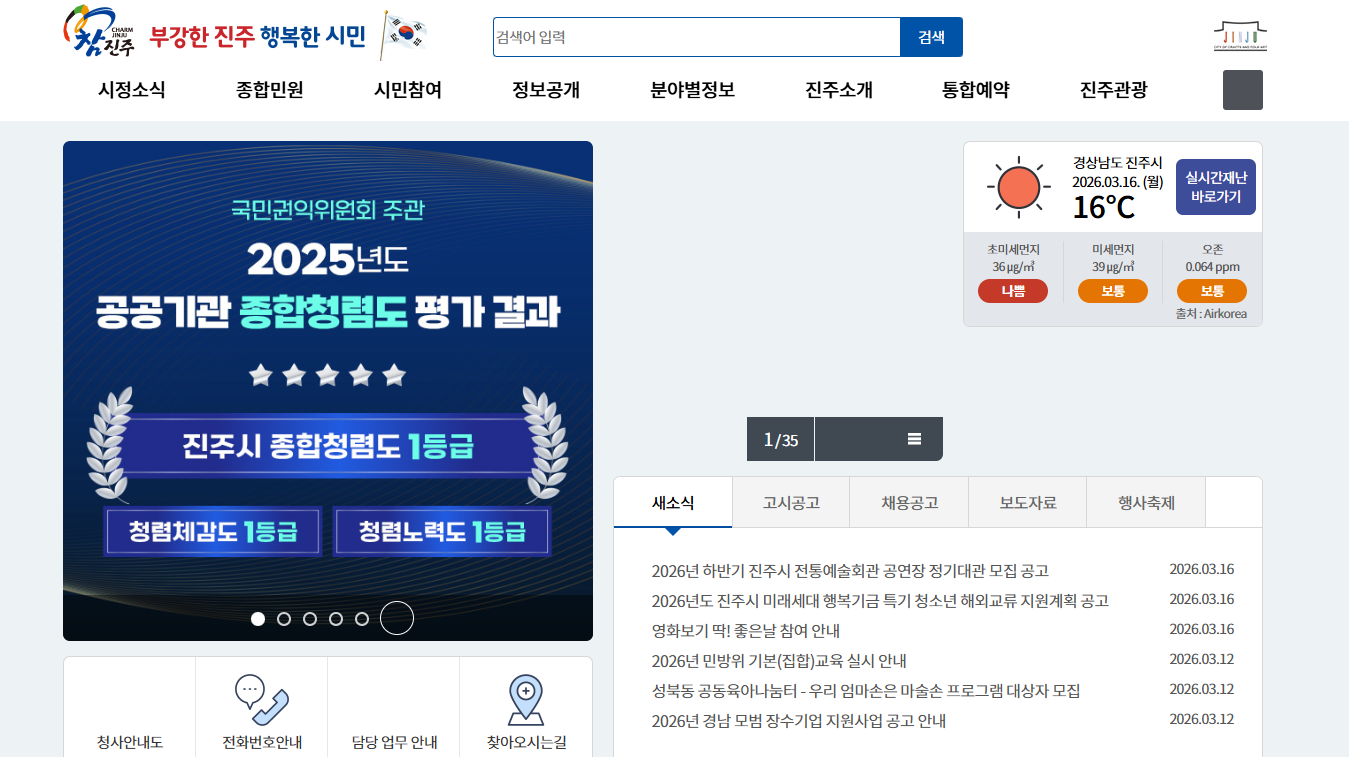 진주시청 홈페이지는 대한민국 공식 전자정부 누리집으로, 경상남도 진주시 동진로 155(상대동)에 위치한 진주시청이 운영하는 디지털 행정 서비스 통합 플랫폼입니다. 민원사무편람, 민원 편의 시책, 여권 발급 안내, 대형 폐기물 신청 등 시민이 자주 찾는 행정 업무를 웹과 모바일에서 모두 처리할 수 있도록 구성되어 있습니다.